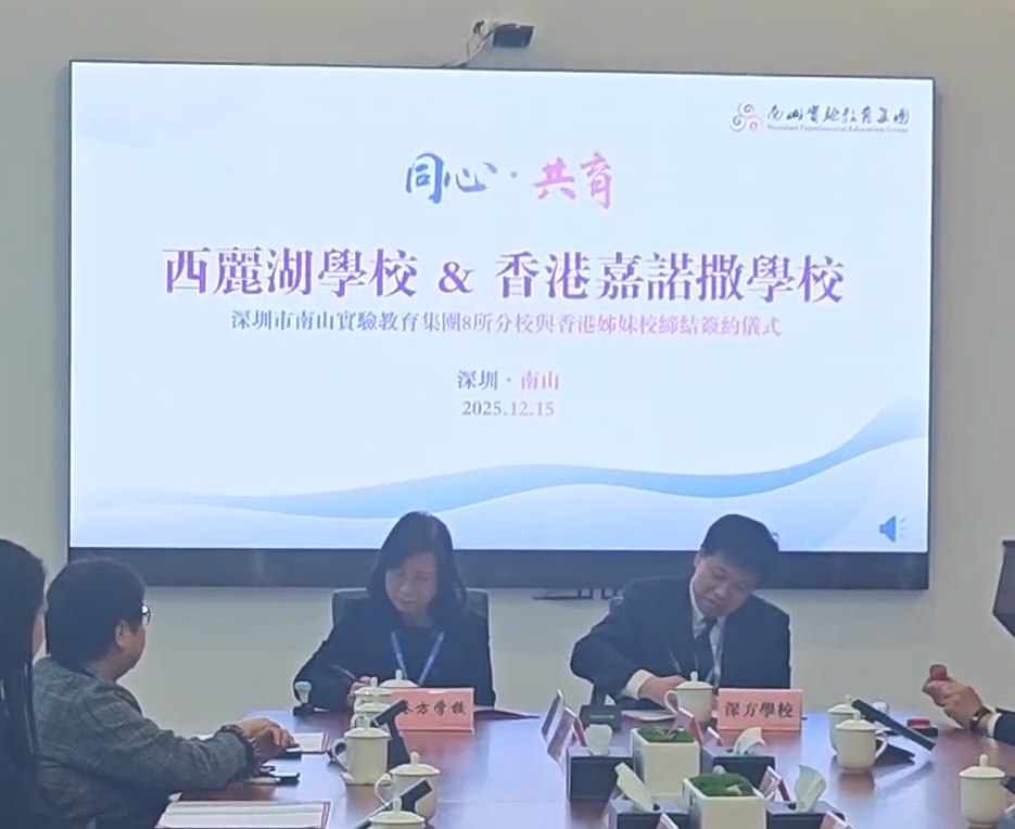 為促進粵港澳大灣區教育交流與合作,增進兩地學子相互學習,本校與深圳市南山實驗教育集團西麗湖學校於20251215日(星期一)上午,在深圳市麒麟中學舉行了隆重的締結姊妹學校簽約儀式。儀式上,兩校校長代表各自學校,在友好熱烈的氣氛中簽署了姊妹學校合作協議,標誌著兩校正式建立緊密的教育夥伴關係。此次締約不僅是兩校情誼的開端,更是日後深度交流的重要基石。