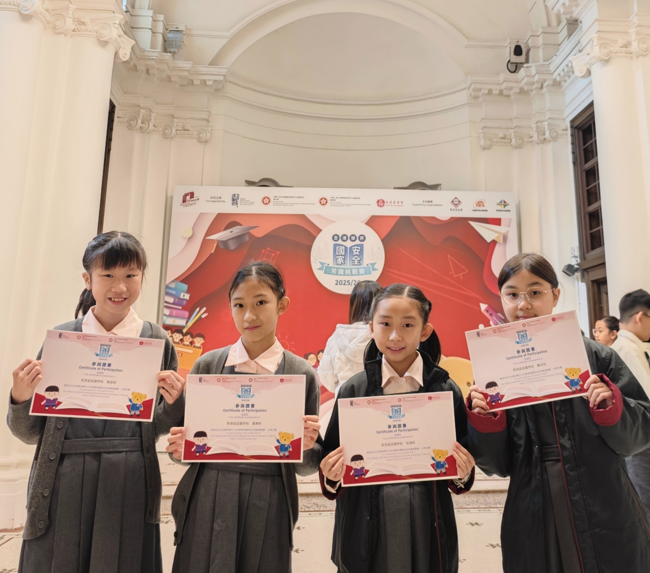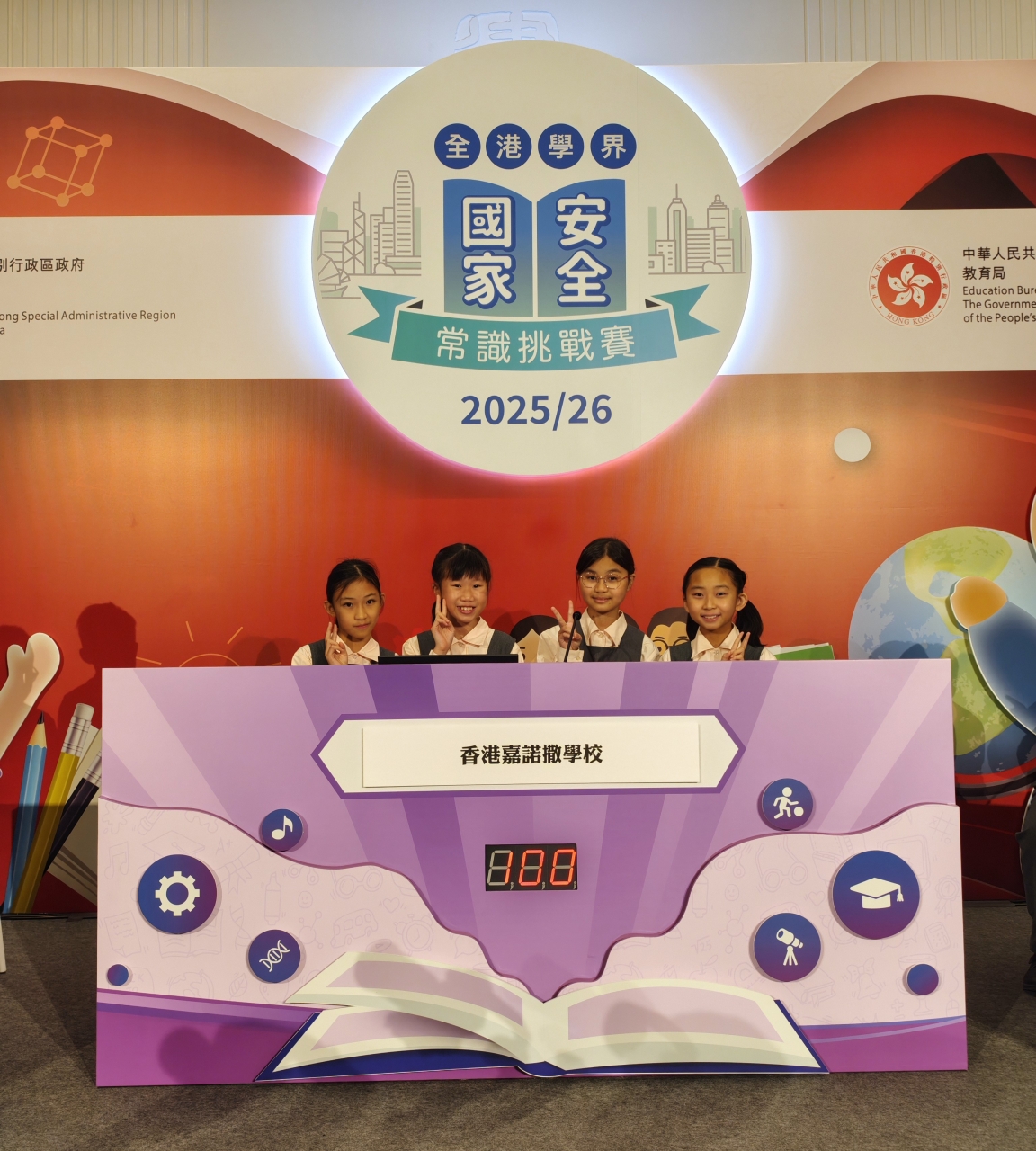 為提升學生對國家安全的認識,培養國民身份認同,本校學生早前積極參與「全港學界國家安全常識挑戰賽」。同學在首階段的網上問答初賽中表現出色,成績優異,因而成功取得晉級資格。隨後,本校派出四位從初賽中脫穎而出的六年級學生,於20251119日(星期三)前往中環炮台里1號前法國外方傳道會大樓一樓,參加現場舉行的準決賽。賽事設有緊張刺激的搶答環節,我校代表全情投入,他們反應敏捷、積極作答。即使面對不確定答案的題目,他們亦毫不怯場,勇於嘗試,盡力爭取每一分,充分展現了求學求真、迎難而上的可貴精神。同學們從網上初賽到現場準決賽的優秀表現,是個人努力與學校重視國民教育共同成果的體現。期待他們在未來的學習中繼續保持這份積極進取的態度,力爭佳績!