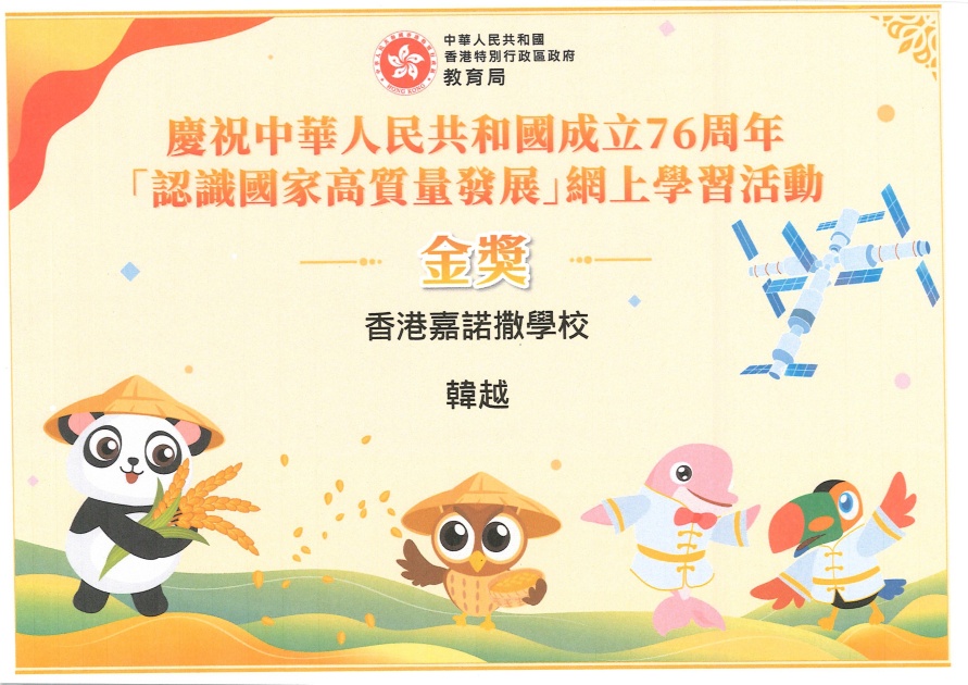 為慶祝中華人民共和國成立76周年,本校學生積極參與由教育局主辦、香港教育城協辦的「認識國家高質量發展」網上學習活動。活動以網上闖關形式進行,設三關影片及問答,涵蓋航天科技、人工智能、碳中和、非物質文化遺產及「一帶一路」基建等國家新時代發展成就。學生須答對半數題目方可過關,極考驗專注與理解力。