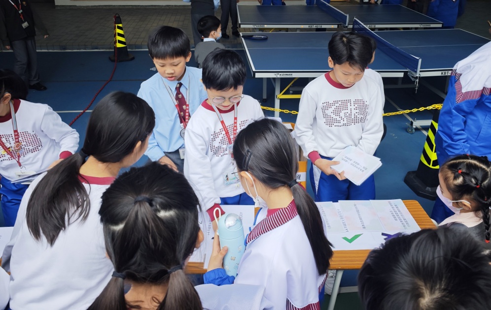 其後,學校於全天小息及午息時段,在操場設置了憲法知識攤位遊戲。同學們透過抽取寫有憲法或基本法描述的卡牌,判斷內容正誤。透過遊戲可以鞏固學生的法治觀念,培養他們成為具國家觀念、尊重法治、負責任的公民。這次活動反應非常熱烈,令人欣喜的是,不少同學能迅速且準確地答對所有題目,這不僅顯示他們對相關內容已有穩固的認知基礎,更反映了平日國民教育課程的學習成果。是次活動成效顯著,成功以寓教於樂的形式,將宏觀的憲制知識轉化為生動的互動體驗。活動不僅提升了同學對國家根本大法的關注度與熟悉度,更在他們心中強化了 「尊法守法」的意識及對國民身份的認同感。許多同學在活動後表示,對憲法與基本法的關係有了更清晰的認識,明白到維護國家安全與自身息息相關。