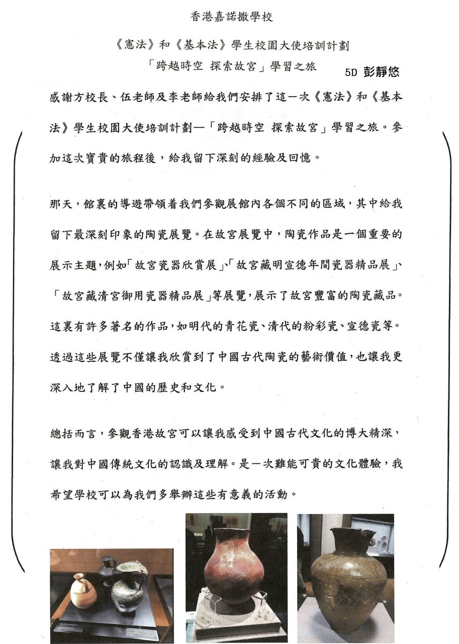 為了加深學生對中國藝術和中華文化的欣賞,本校於2023年3月30日(星期四)下午2:30 至 6:00參加了教育局委託香港故宮文化博物館舉辦的「跨越時空探索故宮」學習之旅。學習之旅分為兩部分,包括保存及修復文物的影片欣賞,以及由博物館專業導賞員與大使分享館內精選展品的故事。透過這次旅程,學生不但能深入了解館內的展品及它們背後的故事,更能知道修復文物的方法及明白保存文物的意義。學生可以從發掘中國文化藝術與歷史寶庫及其藴含的文化意義中,增加對祖國的認識,及進一步培養對中華文化與歷史的興趣。