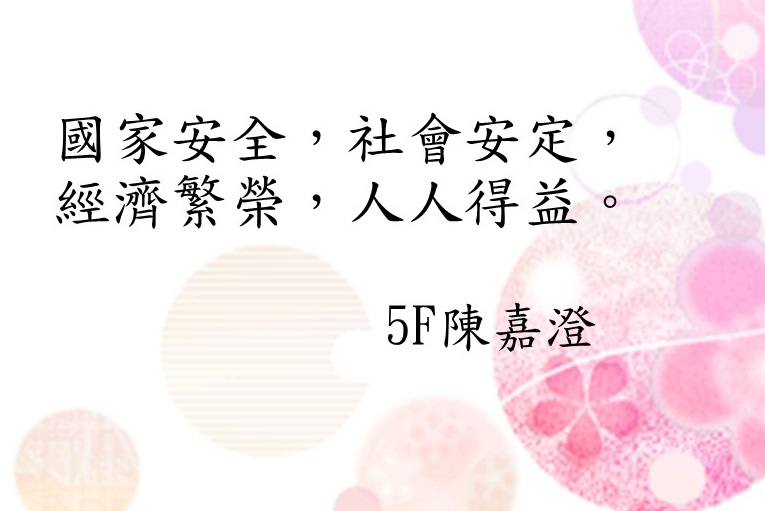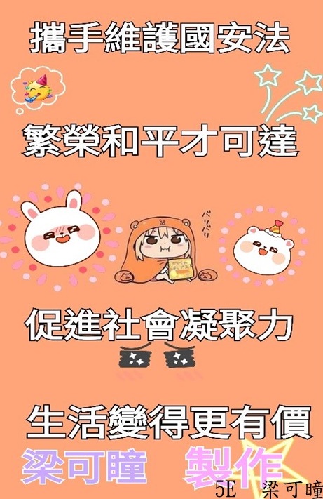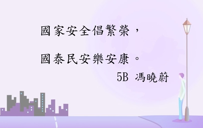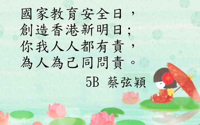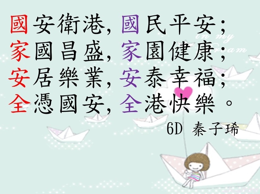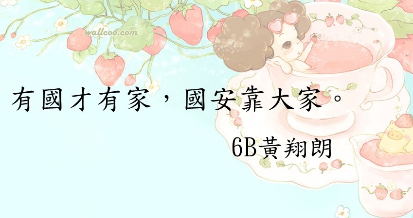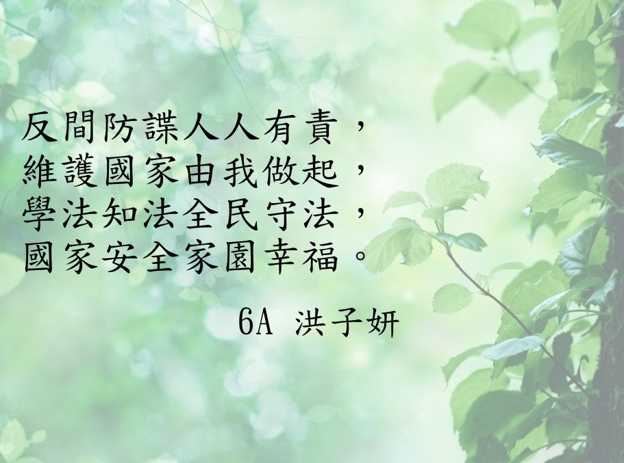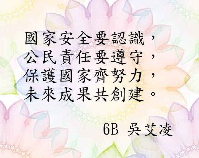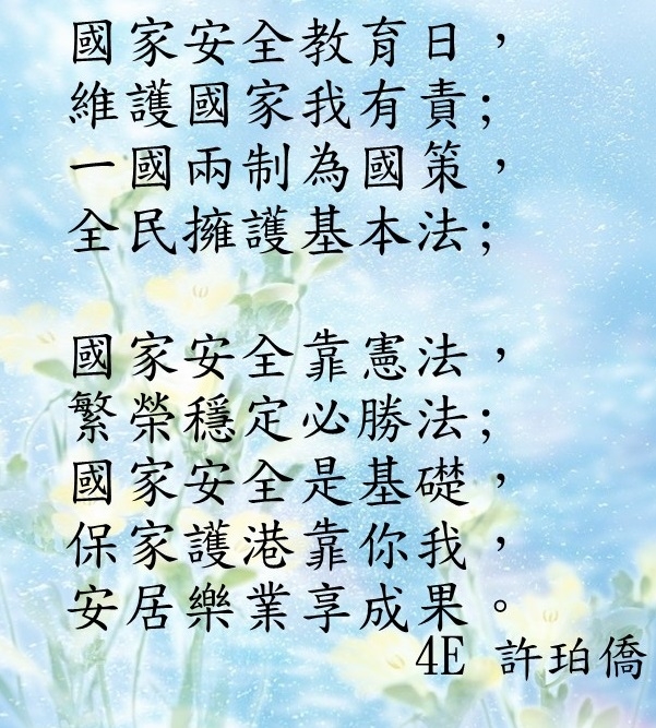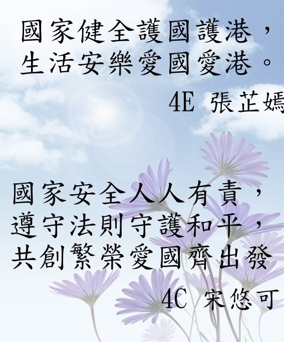 為響應四月的「國家安全教育日」,本校於四月推出一項親子活動 : 國家安全標語創作,學生與家長一同觀看有關國家安全的影片後,創作標語回應相關內容,並上載到Google Classroom「國家安全教育日親子活動:標語創作」。