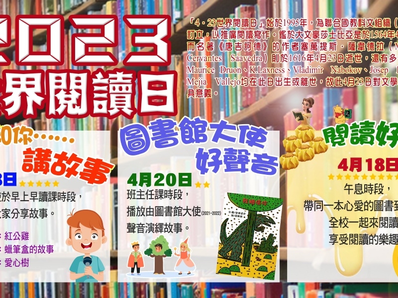 四月二十三日為世界閱讀日(World Book Day),本校希望藉由全世界對此節日的慶祝,同學們能更關注閱讀、多提倡閱讀活動,從閱讀中找樂趣。為響應這天的「世界閱讀日」推廣閱讀文化,圖書館會在4月18日及4月20日舉行「4‧23」世界閱讀日「閱讀好滋味」活動,當中包括: