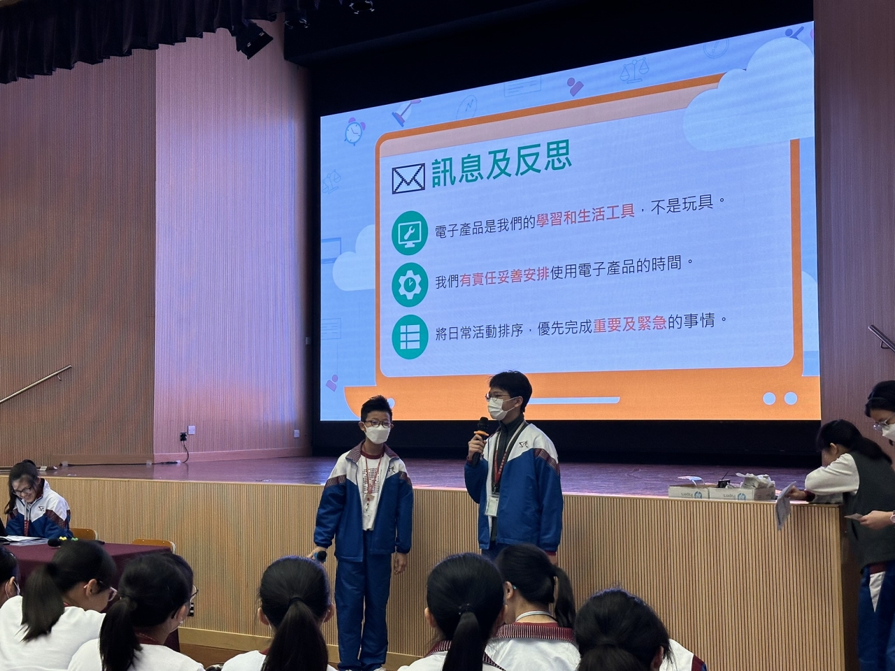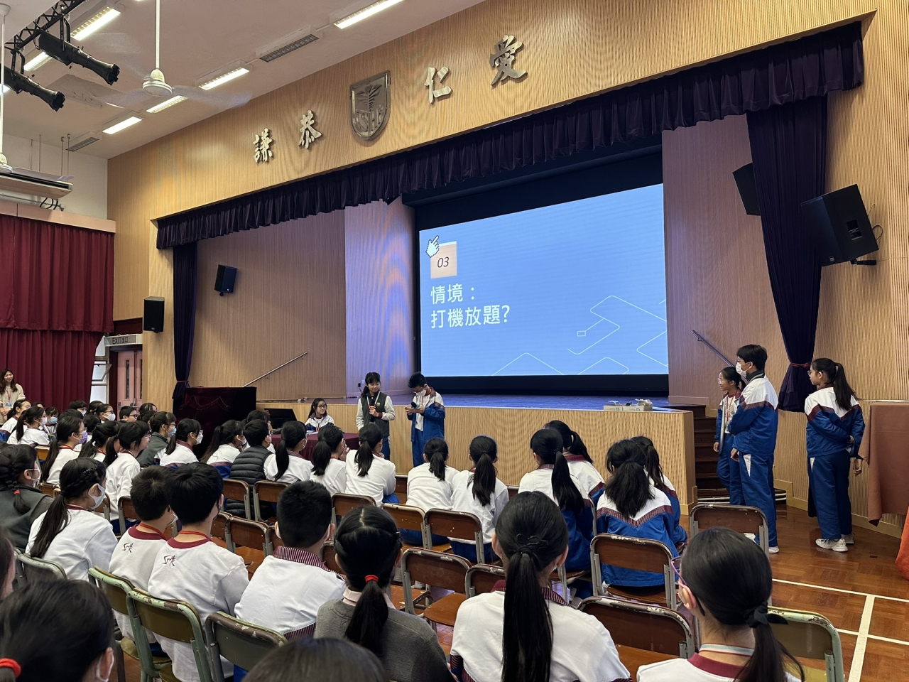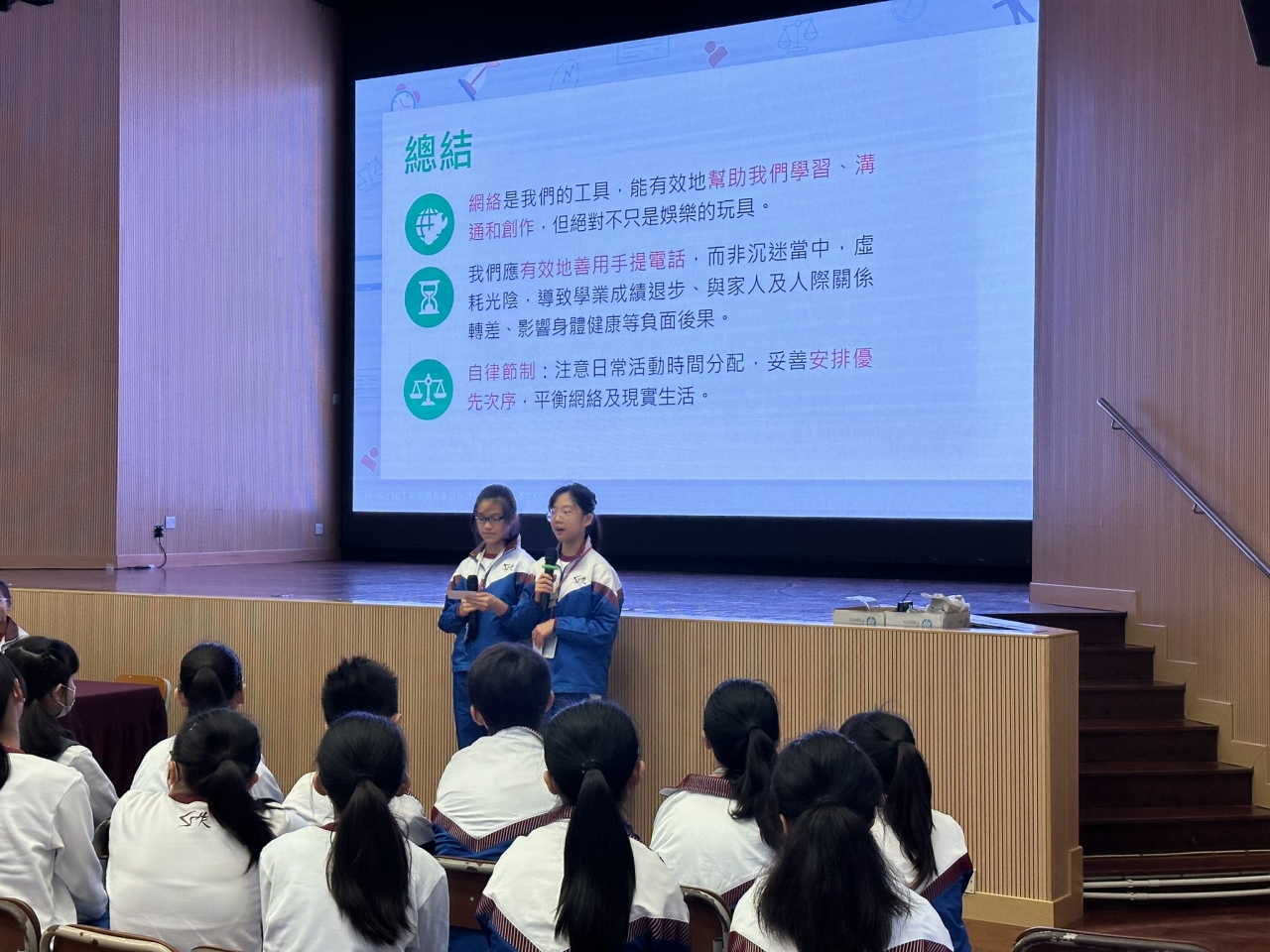 是次級會的主題是「自律守規 – 智NET小達人」,老師讓學生做級會主持,帶領同學認識如何健康地使用手提電話和學習如何平衡上網與現實生活。首先,主持先通過介紹「使用電話量表」,著學生檢視自己使用手機的習慣。通過觀看短片,引起學生的思考過度使用手機的影響。然後,觀看學生演出的短劇,讓學生了解我們有責任妥善安排使用電子產品的時間。最後,由同學分享有效善用電子產品的心得。這次級會希望學生學會電子產品是有效地幫助我們學習、溝通和創作的工具,能,但不是娛樂的玩具,我們應有效地善用手提電話,並懂得自律節制,注意日常活動時間分配,平衡網絡及現實生活。