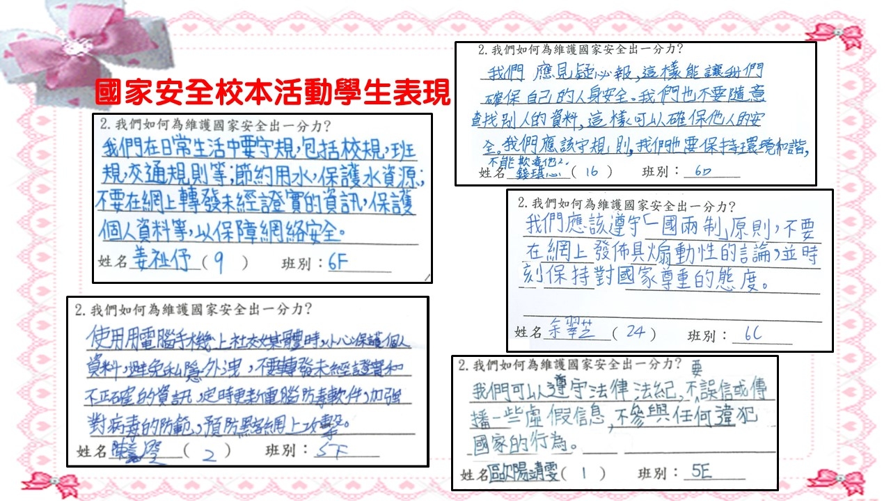 當天早上班主任派發「國家安全」活動紙給同學,同學在小息時到操場觀看「國家安全」的展板,並填寫活動紙,再交回收集箱內。同學非常踴躍參與活動,超過90%的學生有繳交活動紙。從同學的活動紙中的表現,可看出同學們對「國家安全」有一定的認識,而且明白怎樣。