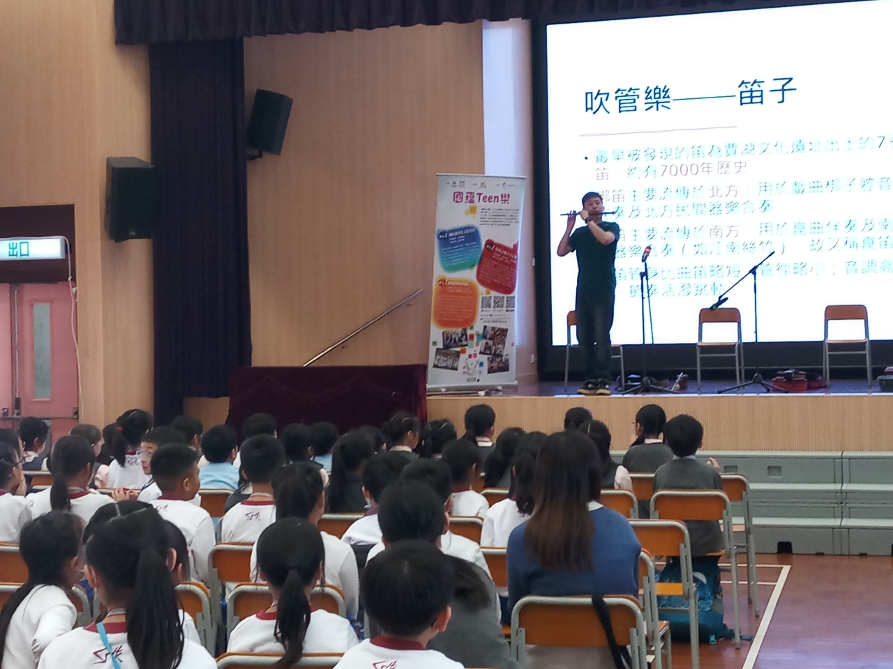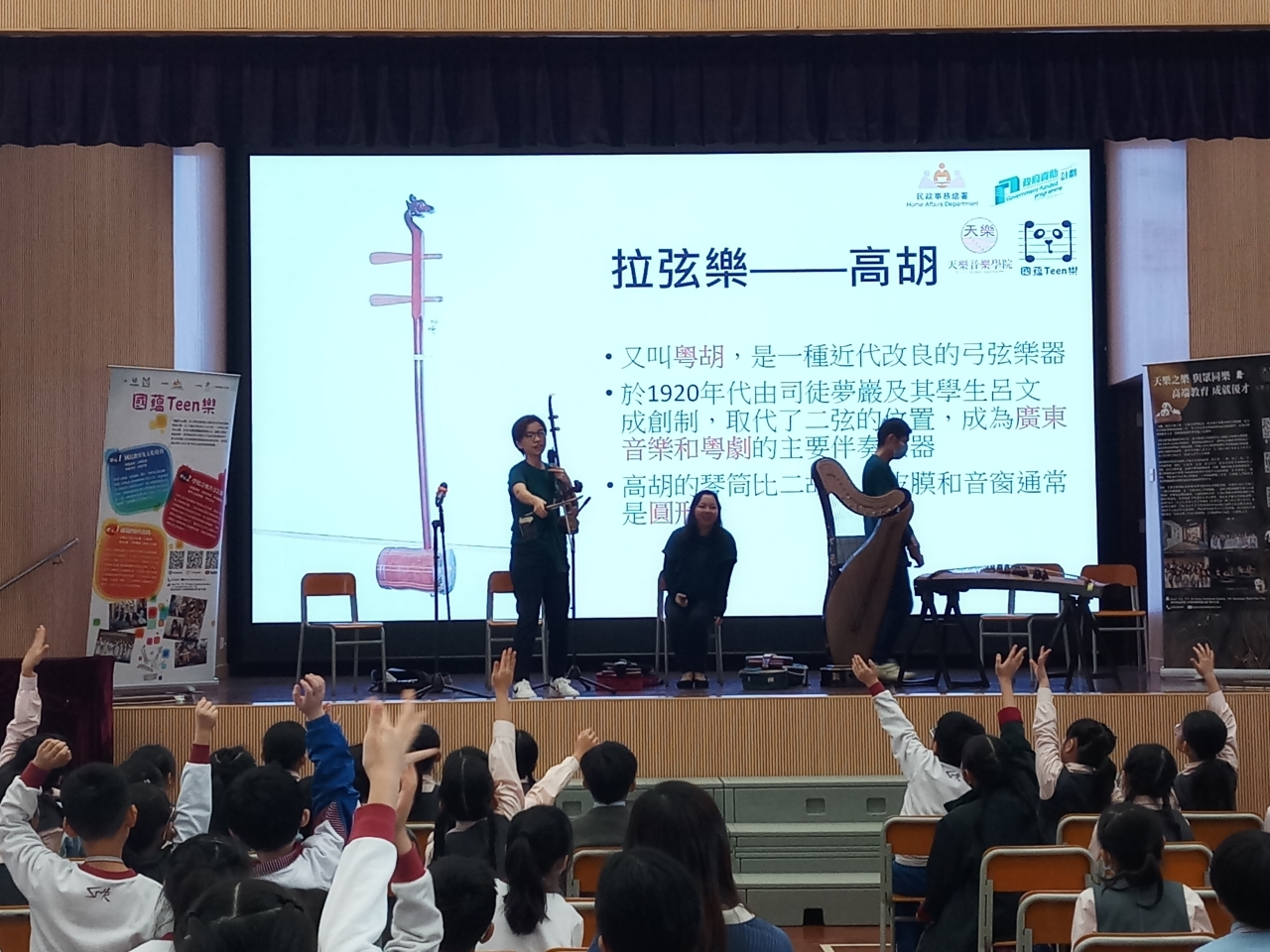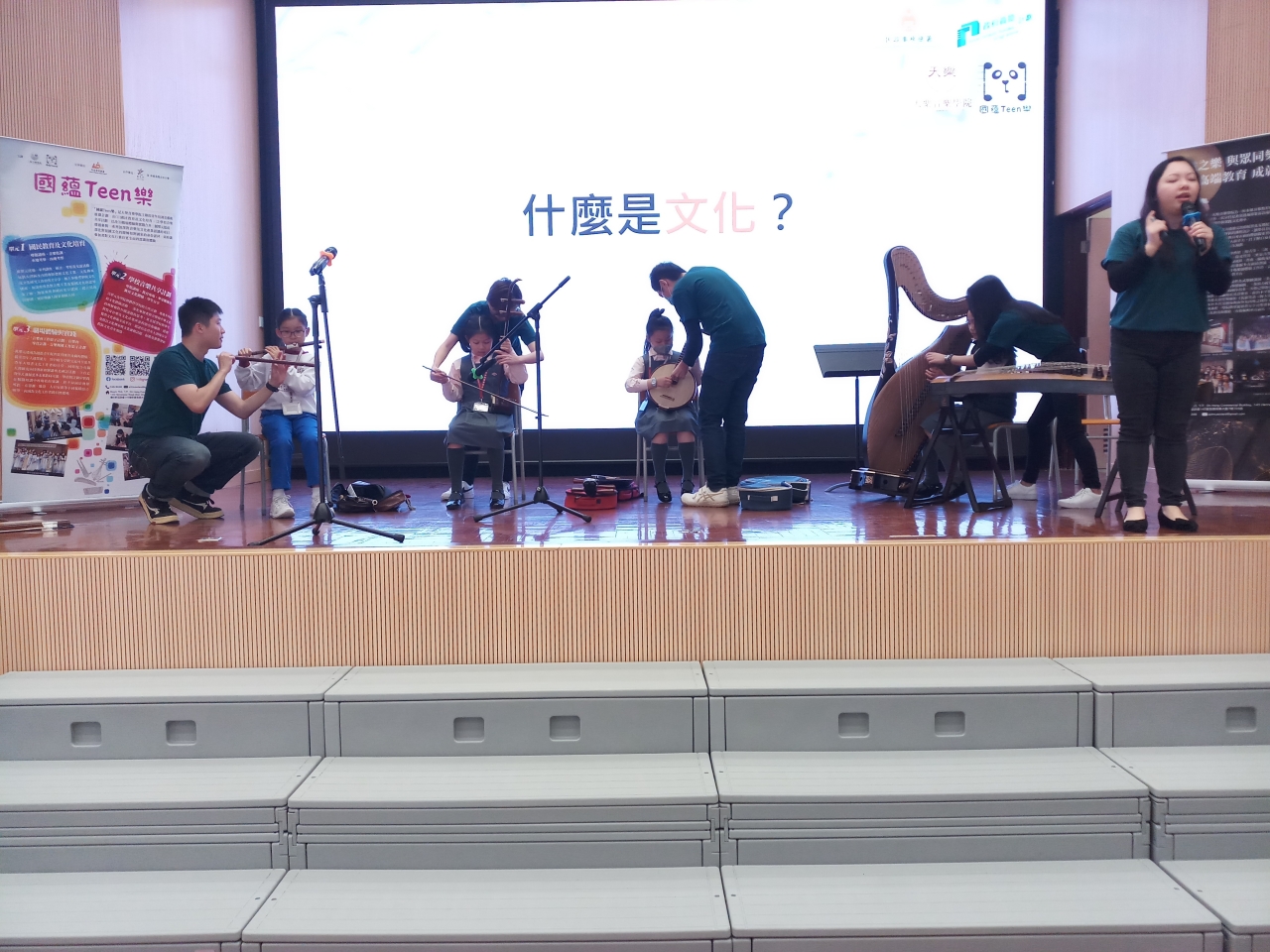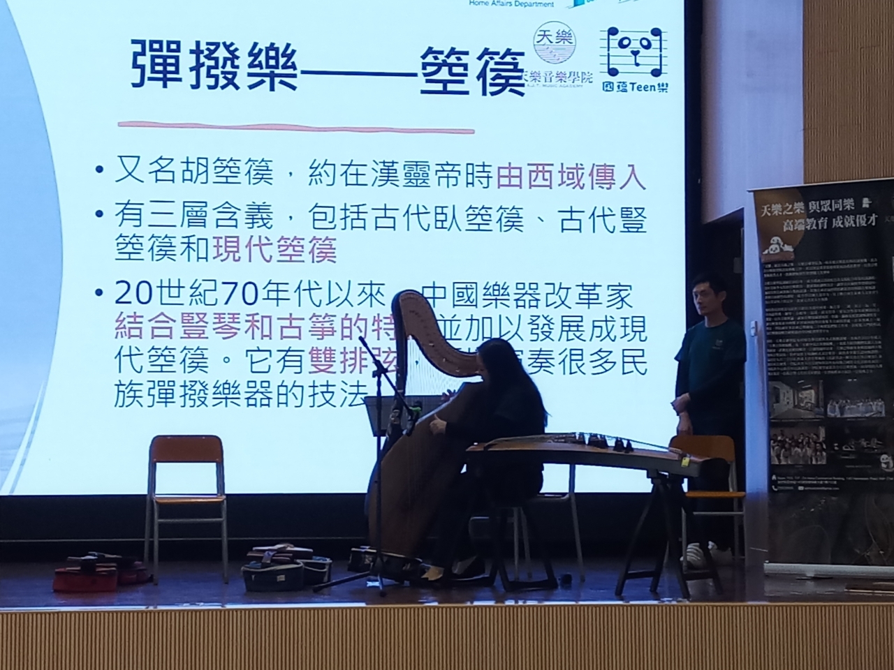 十二月十一日(星期三),本校三年級的學生在禮堂參加了由天樂音樂學院主辦、香港特別行政區民政事務總署支持的「國蘊Teen樂」計劃。計劃旨在加深參與者對祖國文化的了解,加強參與者國民身分認同,以及激發學生對中華文化的美學探知及藝術審美能力。音樂家們為學校帶來了教育專場音樂會,樂師在演奏獨特的中國古樂器之餘,學生們也能親身體驗,增進了同學們對中華文化的了解,並提升了他們對音樂的興趣。