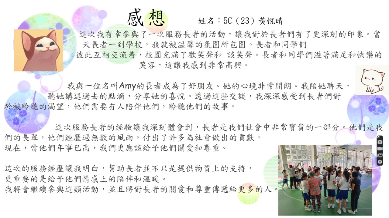 五年級的義工實踐計劃為30位同學提供培訓和機會讓同學參與義工服務,身體力行幫助有需要的人,並且在參與服務前提供培訓,包括:進階義工訓練、服務技巧、服務體驗、服務後解說,讓同學在服務前有更充足的準備及更理解服務對象的需要。同學可以從服務中培養投入和盡責的態度,並能體會服務他人的喜樂,獲得難忘及有意義的經歷。同學們於10月25日星期三進行服務前培訓,並於11月1日星期三服務老人中心的長者,服務後更有反思活動。同學們在服務後反思時都覺得這次活動很有意義、很有滿足感,他們都很主動與長者談天,和長者一起玩遊戲,一起利用彈力帶做健康操,感到很開心! 同學們表示下次再有這些活動的時候,都非常樂意再參加,因為不但可以幫助人,也可以讓他們有學習與人相處和溝通的機會。
