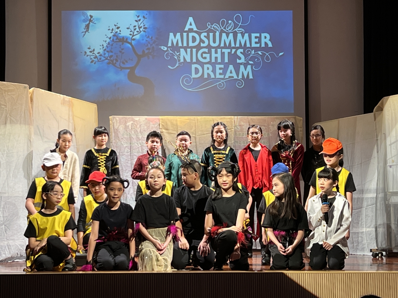 Learning drama can enhance students’ communication skills, creativity and confidence. This year, twenty-one P.5 students began their English drama course in November and had their final performance ‘A Midsummer Night’s Dream’ on 23rd June, 2023. To understand more about drama and William Shakespeare, all P.5 students watched some pre-show videos and also a school touring performance ‘1930’s Radio Play’ held by Shakespeare4All in October. Students also learned and interacted through the pop-up corner.