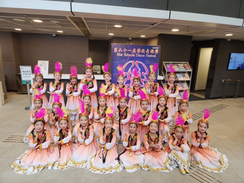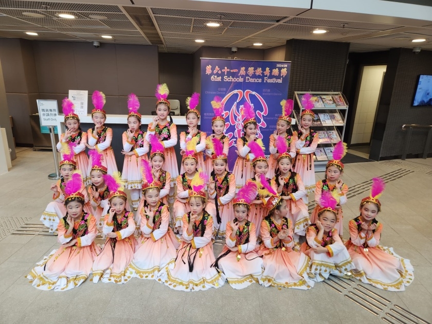 2月20日(星期四),本校25名二至三年級同學,參加了第61屆「學校舞蹈節」比賽,榮獲「甲等獎」。當天,同學演出的是新疆維吾爾族舞蹈。評判讚賞隊員演出認真、投入,動作協調,音樂與舞蹈相得益彰,有表現力,能演出舞蹈主題「歡慶」的氣氛,而舞蹈編排有構思。