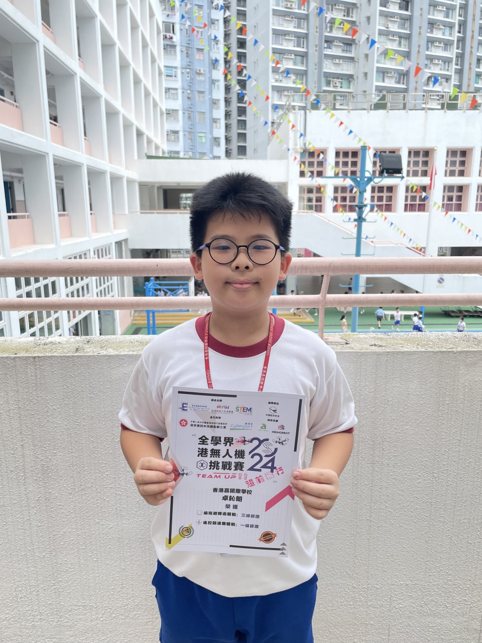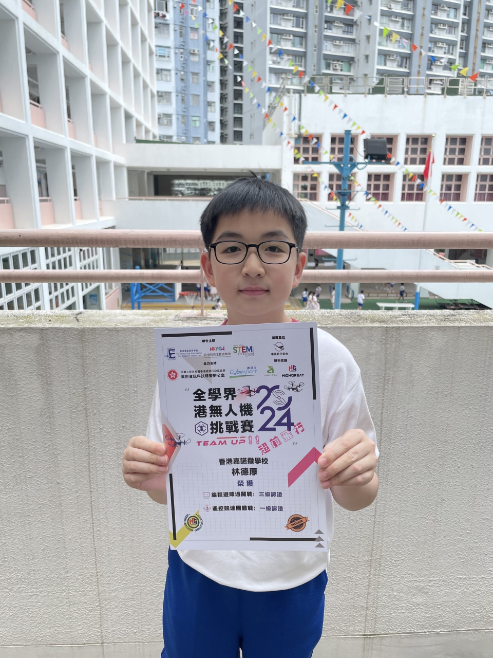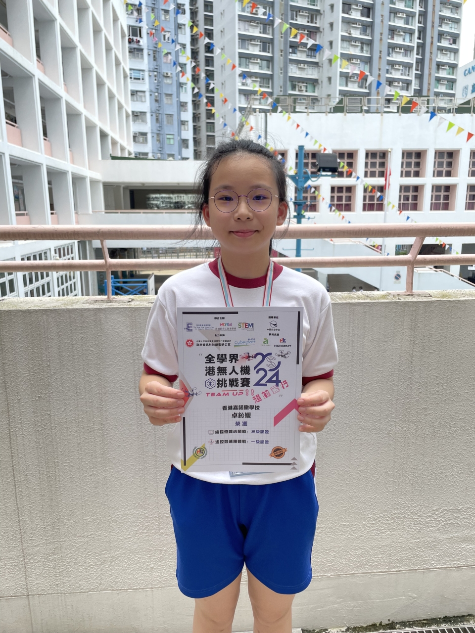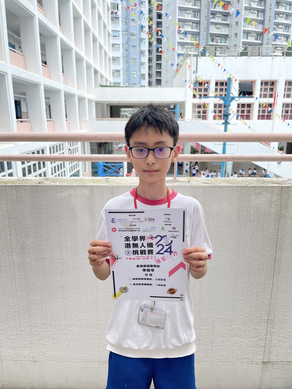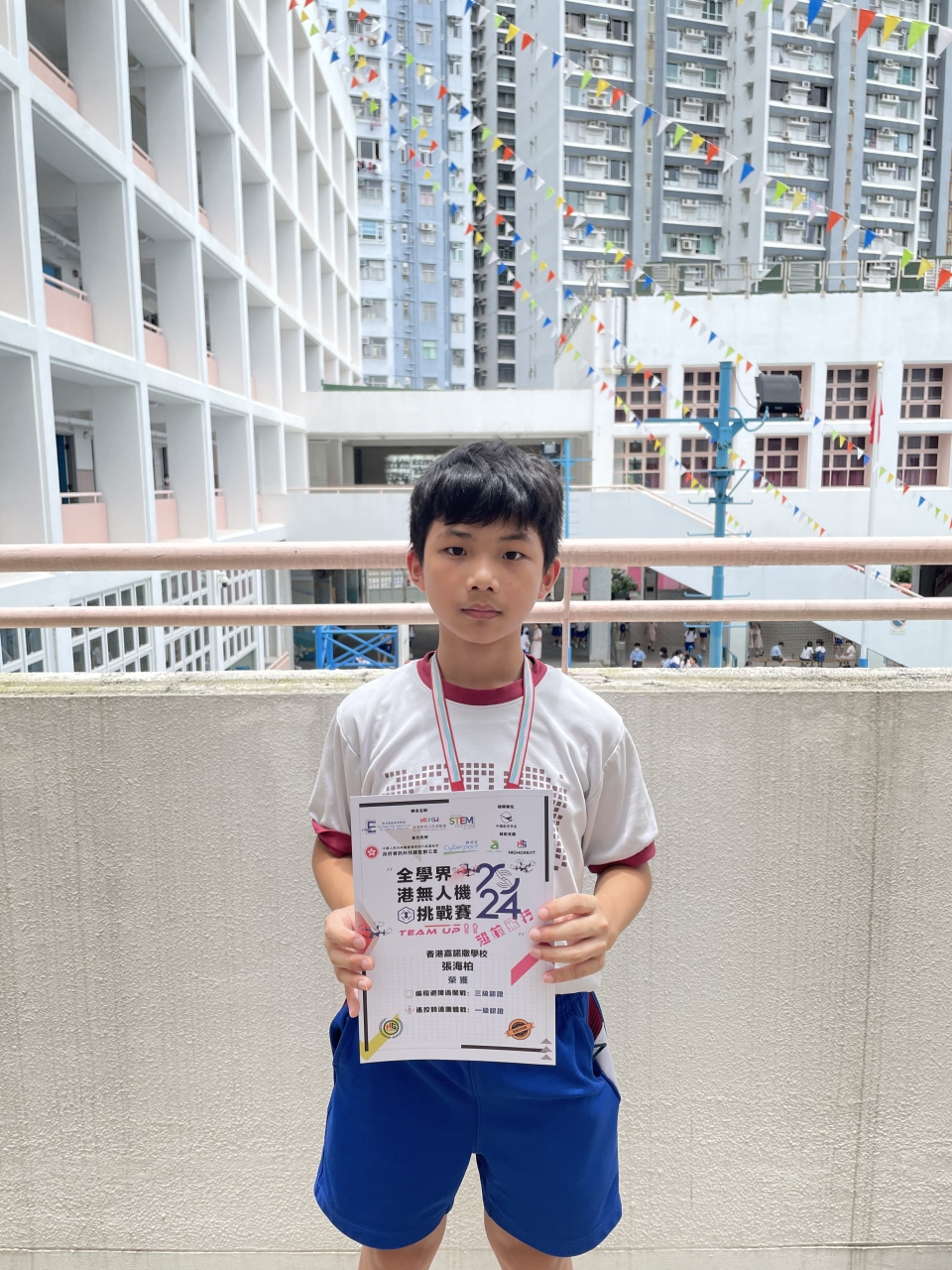 五名參加了多元活動無人機班的同學運用課堂所學,參與了四月二十八日舉行的全港學界無人機挑戰賽2024。比賽分為兩個回合進行:第一回合為遙控競速團體戰,第二回合為編程避障過關戰,賽事以能力認證評級。同學於比賽當天,勇於接受挑戰,盡展所能,發揮團體合作精神,獲取以下佳績。