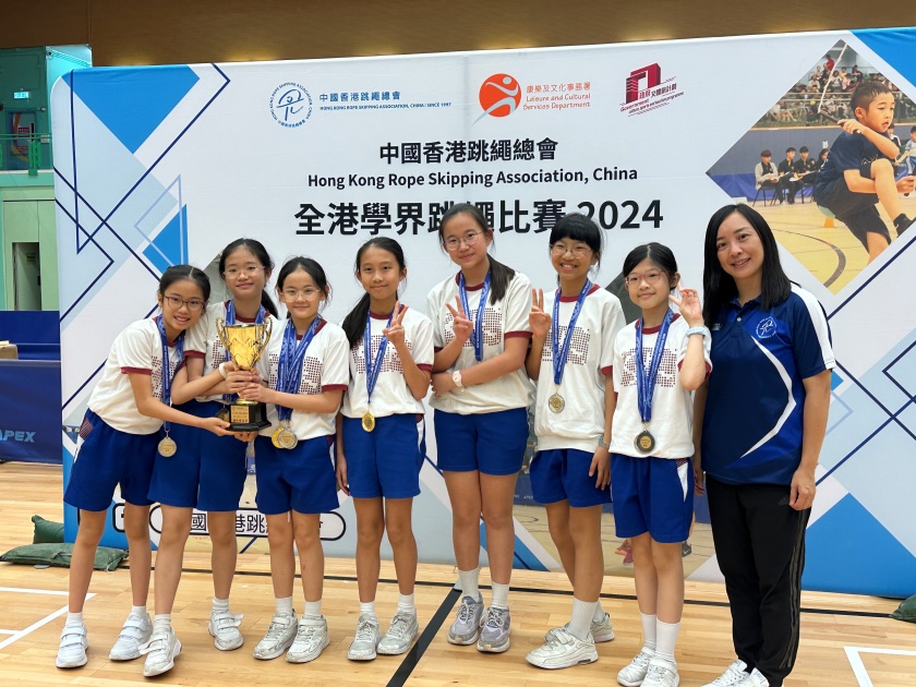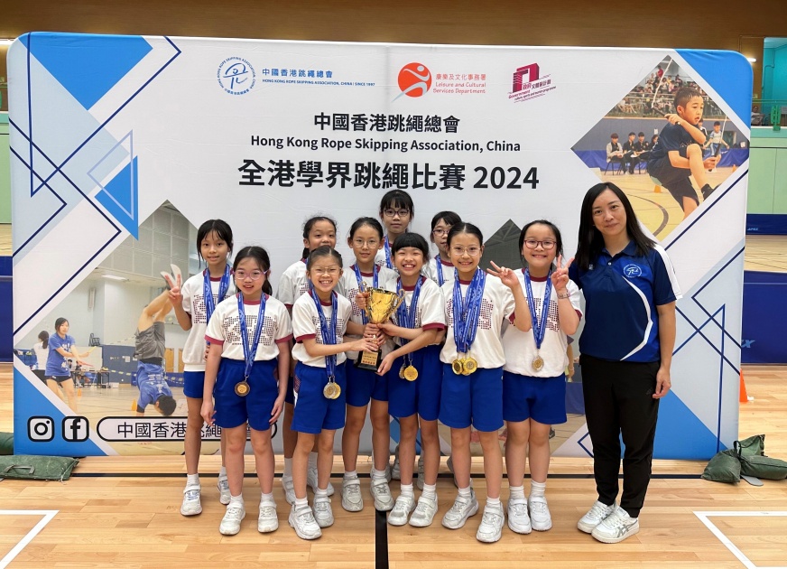 本校花式跳繩隊及初班於6月23日(星期日)參加全港學界跳繩比賽 2024。當天各隊員竭盡所能,最終獲得港島區小學組女子甲組總成績亞軍、女子乙組總成績亞軍。比賽期間隊員均努力奮鬥,大家互相支持和鼓勵。校方特別感謝當天出席為同學打氣和協助的家長。