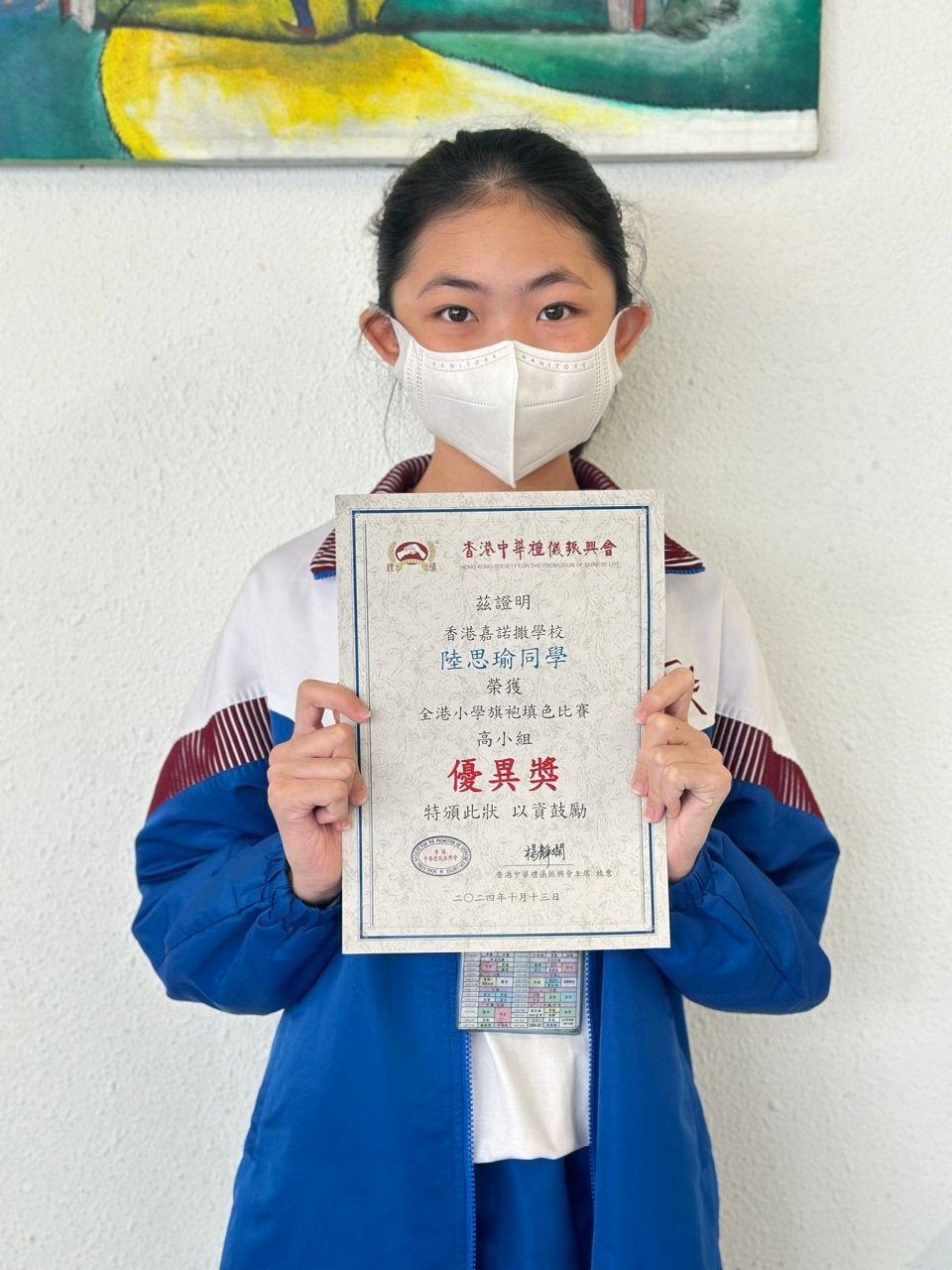 恭喜本校學生6A陸思瑜於全港小學旗袍填色比賽獲得高小組優異獎,在此感謝同學積極參與比賽。
