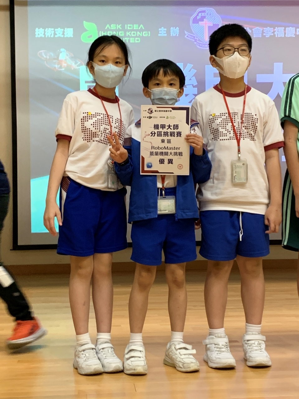 五月二十日(六),本校三名四五年級的機甲大師隊員,到柴灣聖公會李福慶中學,參加了本年度機甲大師東區分區挑戰賽。比賽共分為三大項目,包括無人機穿越障礙賽、能量機關大挑戰及競技挑戰賽。三項比賽同學要充份發揮編程、操控及團隊合作精神,雖然五年級隊員是首次參與比賽,技術比較生疏,但仍奮力作戰,最終取得。「RoboMaster 能量機關大挑戰」的優異獎。