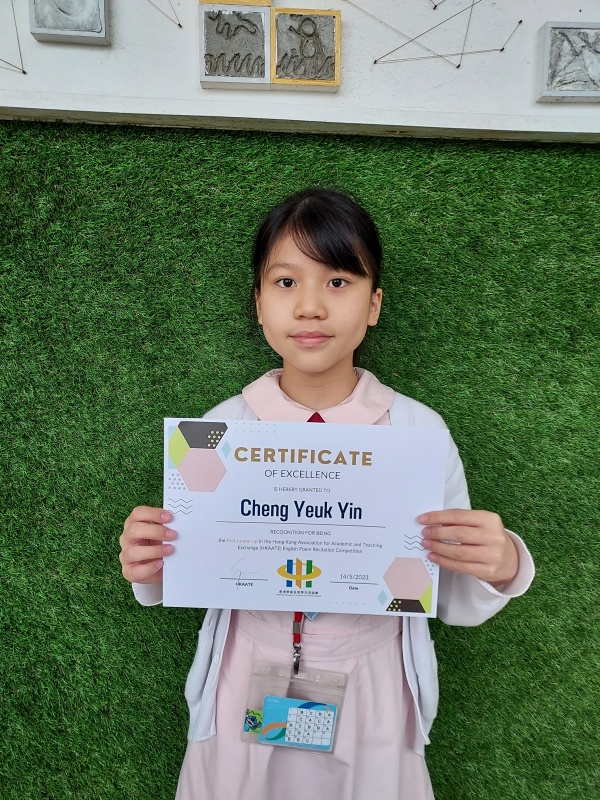 5C班鄭若嫣參加了由香港學術及教育交流協會HKAATE舉辦的英語詩詞朗誦比賽,她憑著生動的演繹方式奪得了以下的個人佳績