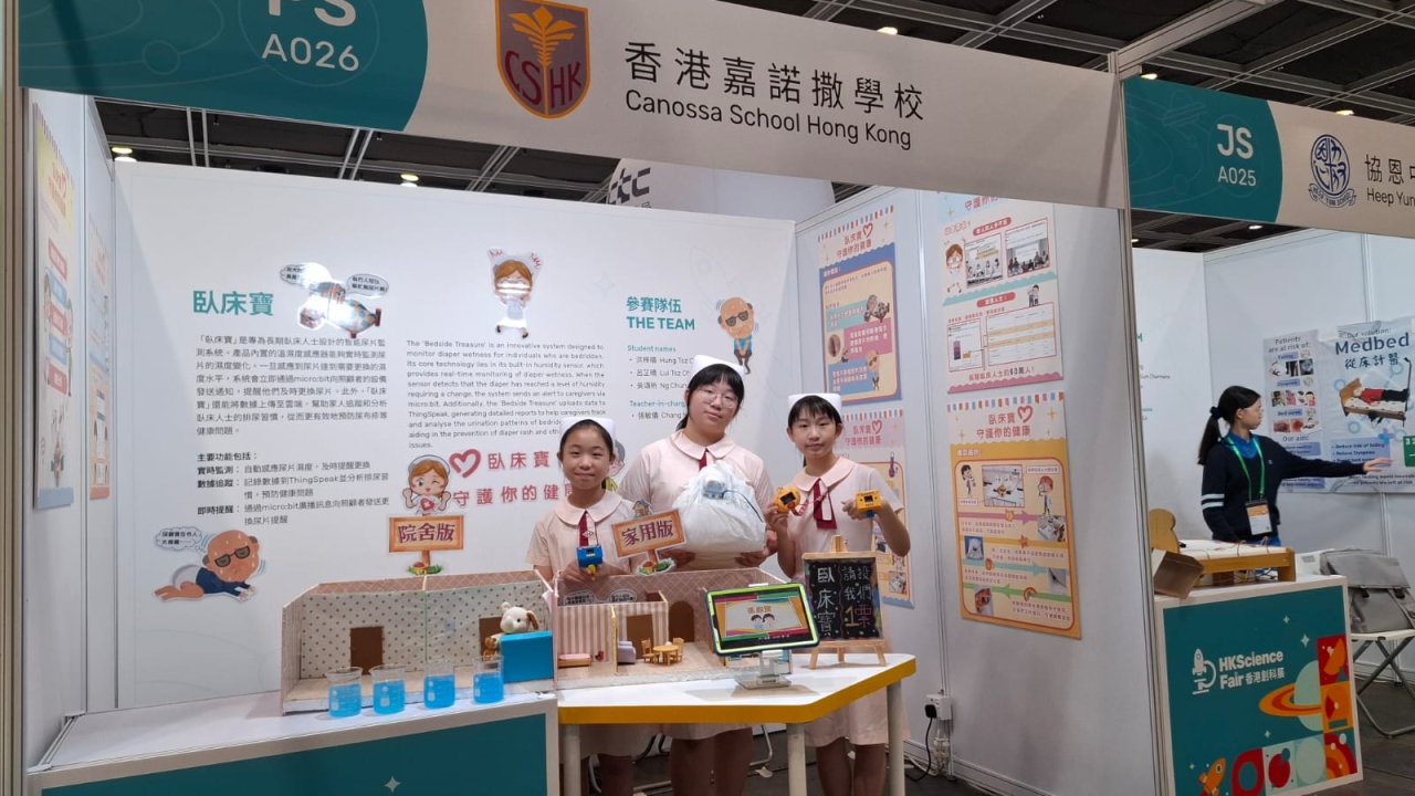 本校拔尖創科隊於2024-2025香港創科展中表現出色!隊員們在6月27至29日假香港會議展覽中心熱情地向公眾介紹他們的創新設計概念,吸引了眾多參觀者駐足了解。當中除了運用Tinkercad 來設計作品的外形,學生更善用日常課程學習的micro:bit和感測器來設計不同的功能。為了更有效地讓家人在遠距離得悉長期臥床人士的尿片情況,學生亦加入了物聯網和大數據的科技,進行自動發送即時消息及資料分析。公眾對學生的作品讚譽有加,尤其欣賞其實用性,並讚揚學生們展現出的 同理心,巧妙地運用科技為長期臥床人士解決生活困擾。期望這項創新未來能在護理界廣泛應用。在此次展覽中,5E吳頌昕、6E洪梓晴和呂芷晴榮獲入圍獎。