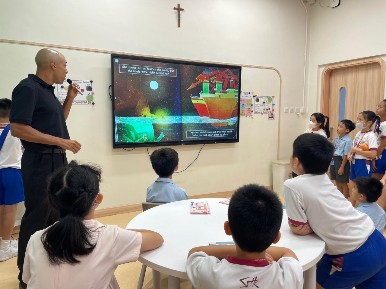 We strive to create a language-rich environment through various activities. English Days, organised biweekly, encourage students to use English through themed games and activities. Additionally, English ambassadors from P4-6 lead prayers in assemblies, enhancing the English-speaking environment. During recess and lunchtime, Native English Teachers (NETs) engage with students in the English Room, promoting conversation and interaction in English.