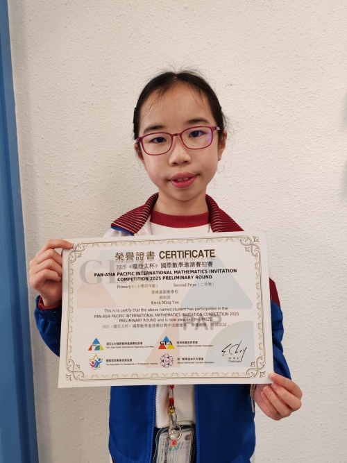 恭喜本校學生4C班郭明茵於2025《環亞太杯》國際數學邀請賽初賽中獲得小四數學組二等奬,在此感謝同學積極參與比賽。