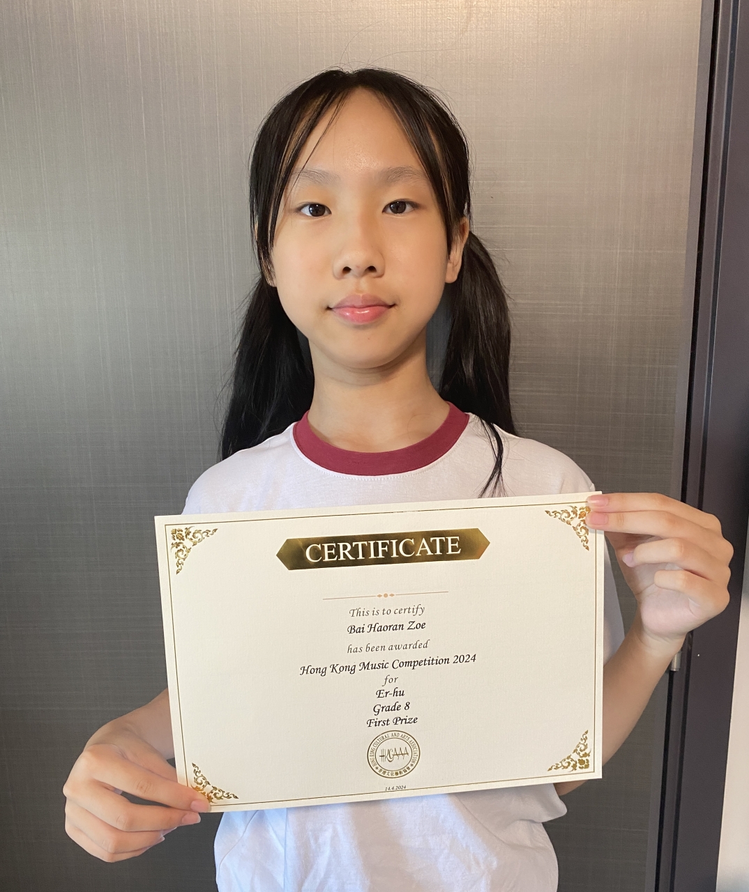 6B班白浩冉同學參加了「Hong Kong Music Competition 2024 for Er-hu Grade 8」,取得