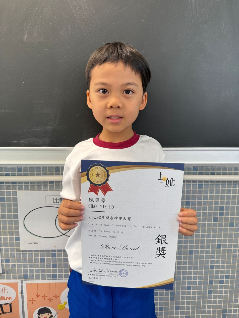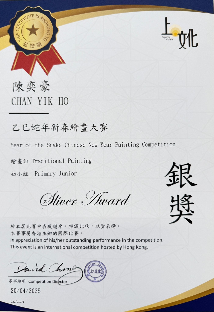 恭喜本校學生1F班陳奕豪同學參加了由「乙巳蛇年新春繪畫大賽」榮獲了