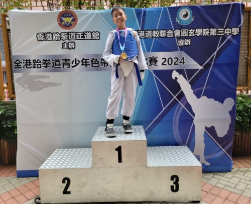 6A班阮家華同學於2024年10月20日參加了香港跆拳道正道館主辦之全港跆拳道青少年色帶及黑帶比賽2024, 並於36-40kg搏擊組勇奪冠軍。