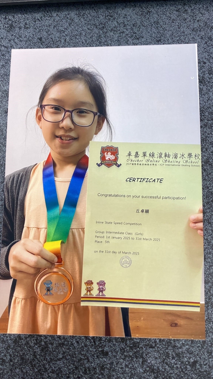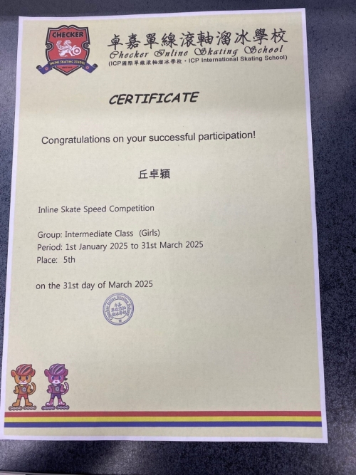 恭喜3A邱卓穎在卓嘉單線滾軸溜冰學校Inline Skate Speed Copmetition(Girls)中,獲得第5名。