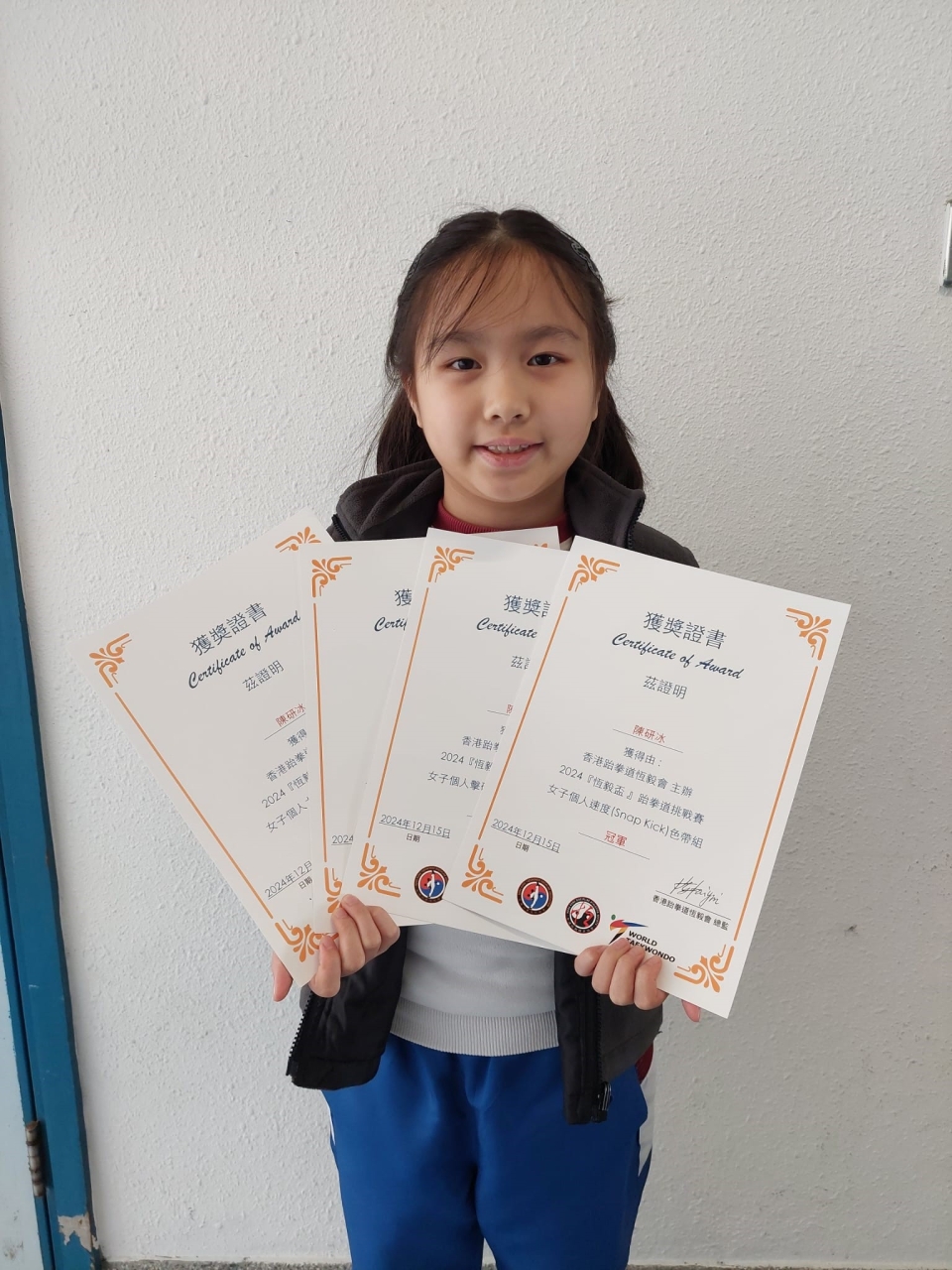 恭喜4F陳妍冰參加了由香港跆拳道恆毅會主辦的2024「恆毅盃」跆拳道挑戰賽,榮獲優異成績。