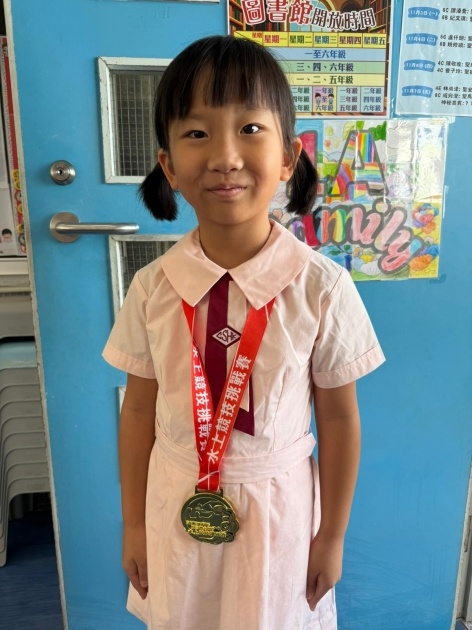 恭喜本校1A班謝芯柔於灣仔區水上競技挑戰賽中表現出色,並在6歲25米背泳賽事中獲得冠軍!