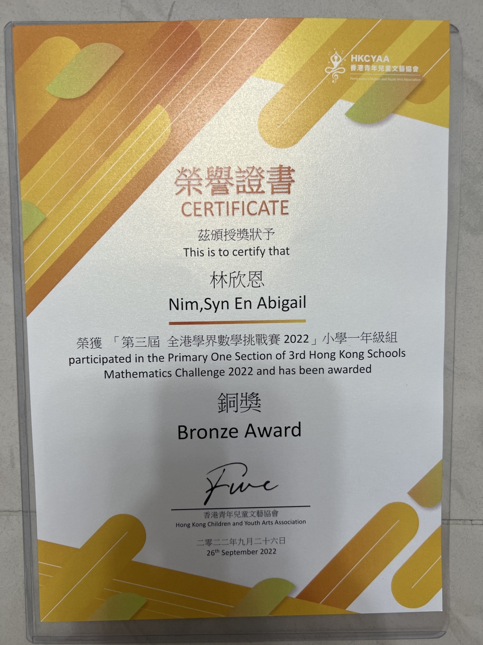 日,參加了由香港青年兒童文藝協會舉辦的第三屆全港學界數學挑戰賽