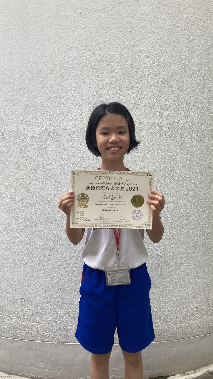 恭喜本校學生4F鄭悅希,於國際藝穗協會舉辦的「藝穗校際音樂大賽2024 – 鋼琴七級」,取得「2nd Place」。