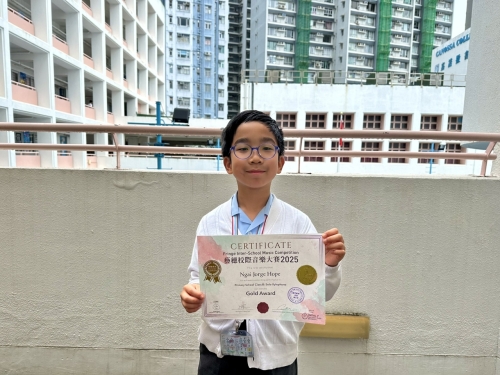 本校學生4B班魏栩浚同學參加了「藝穗校際音樂大賽2025 Primary School Class B:Solo Xylophone」,取得「Gold Award – 2nd Prize」。