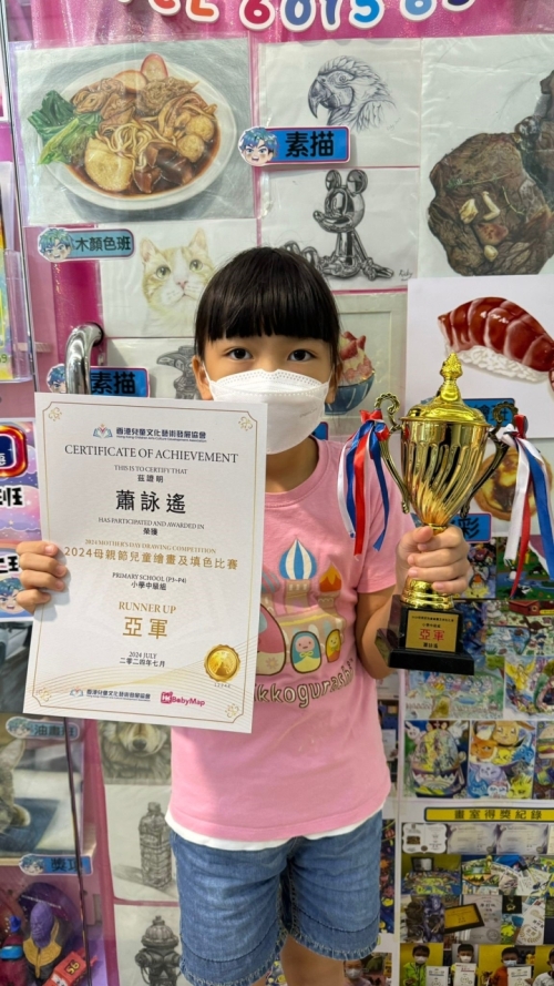 恭喜4F蕭詠遙參與了香港兒童文化藝術發展協會主辦的母親節兒童繪畫及填色比賽,憑著對主題「動物樂園」的巧思妙想和純熟的繪畫技巧,獲得小學中級組(P3-P4)亞軍。