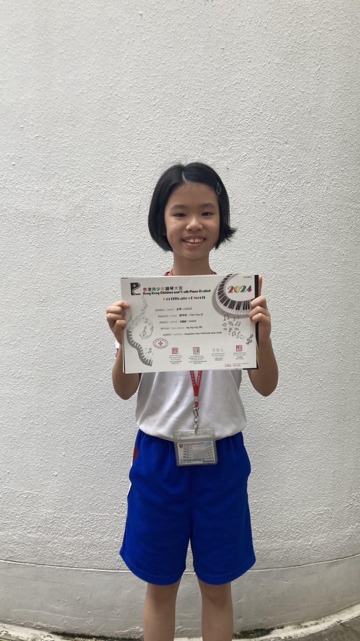 恭喜本校學生4F鄭悅希,於元朗大會堂舉辦的「2024香港青少年鋼琴大賽 – 兒童組」,取得「金獎」。