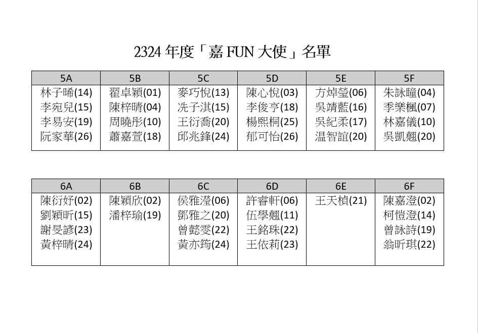 「嘉FUN大使」由五、六年級的學生擔任,負責於小息一、小息二及午息在「嘉FUN角」當值,維持活動秩序及安全,致力保持一個舒適及安全的場地給同學們玩耍,使同學在遊戯中得以放鬆。