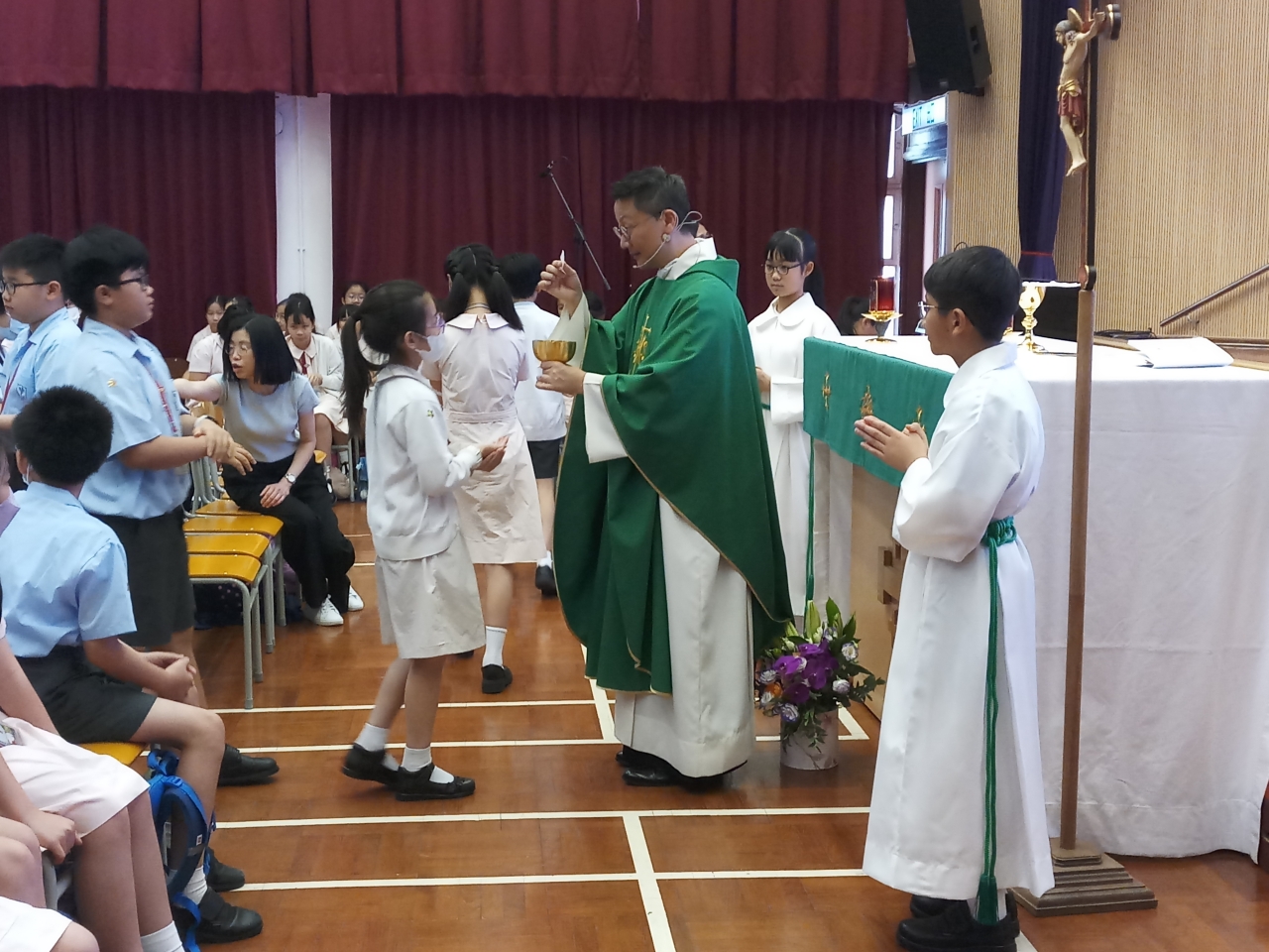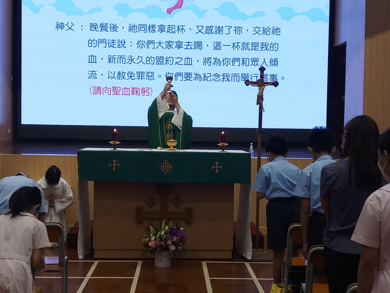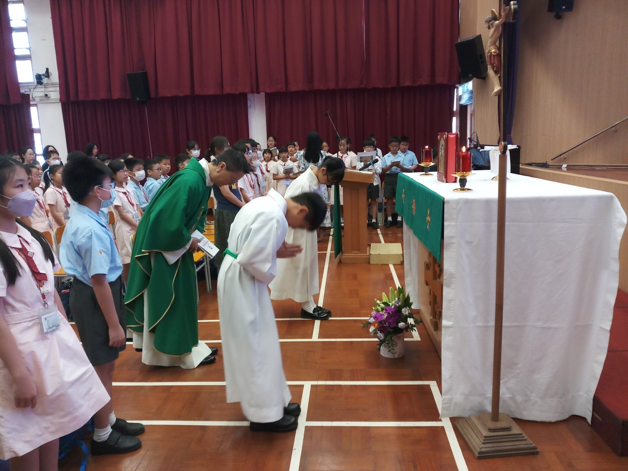 開學感恩祭已於9月17日(星期二) 在禮堂舉行,安排小四、小五公教同學、小六全體同學及全體老師出席。邀請聖猶達堂主任司鐸溫國光神父主禮。感恩祭的主題為「感恩」。主禮在講道中提醒同學應如何裝備自己去迎接新學年的挑戰,亦要懷有一顆感恩的心去領受天主的恩賜,並善用這些恩賜去投入學習。最後全體參與同學與主禮神父一齊拍照留念。祝願同學們滿載天主的恩寵在新學年努力學習,並在生活中學懂「感恩」。