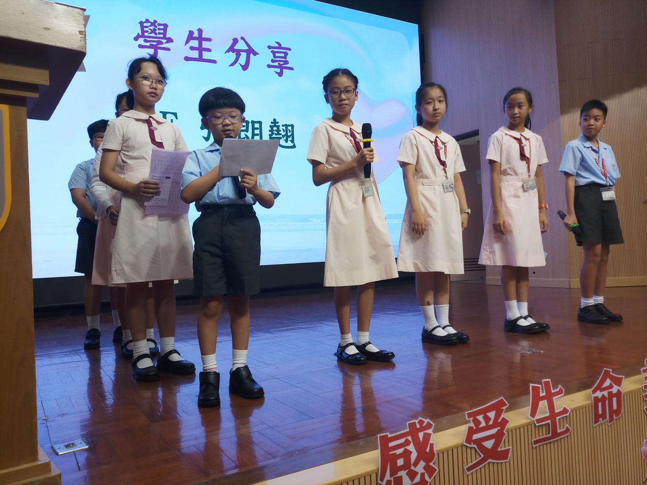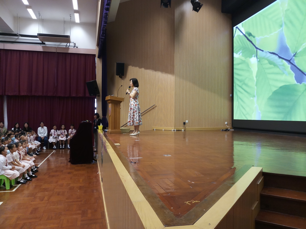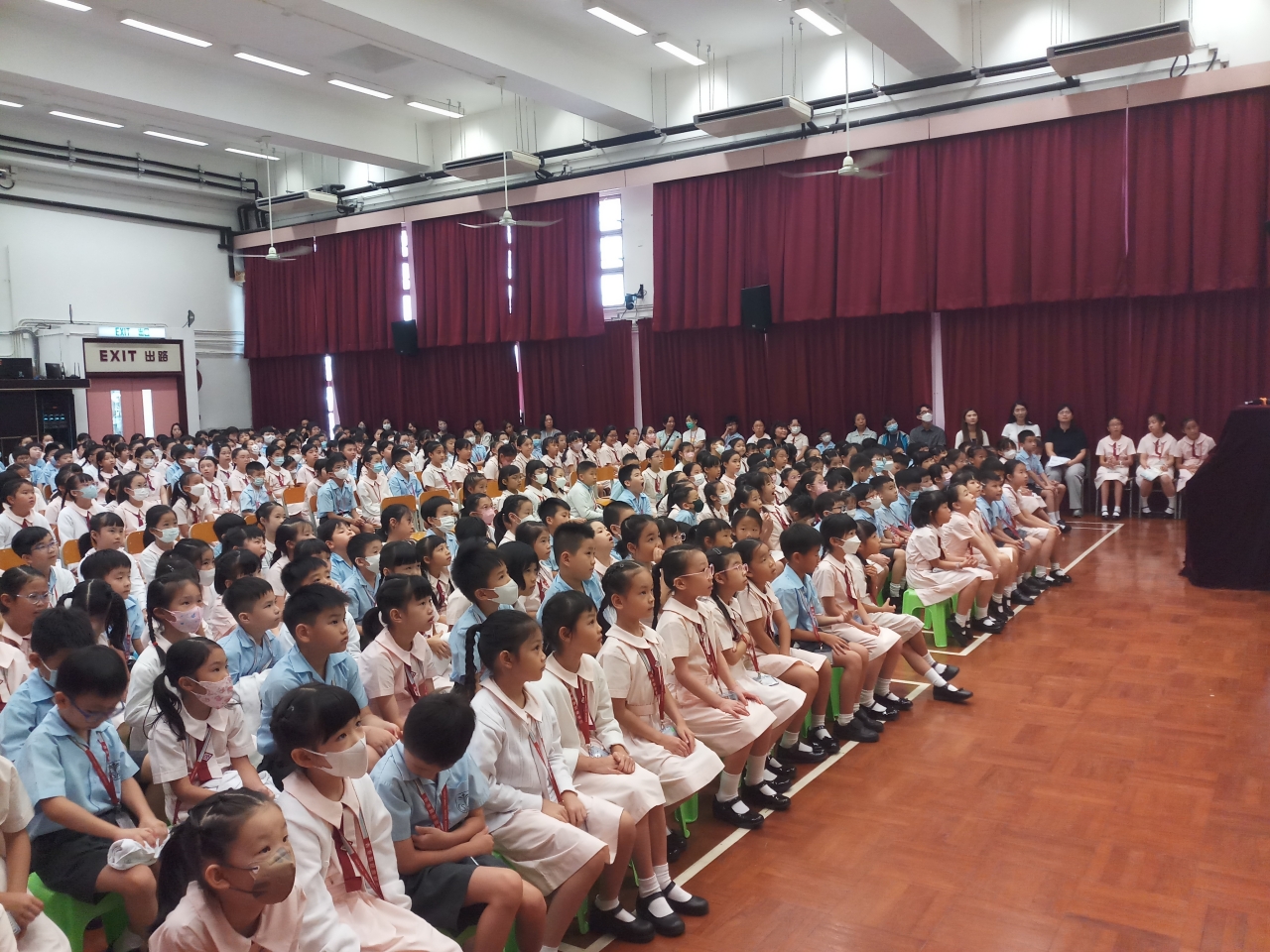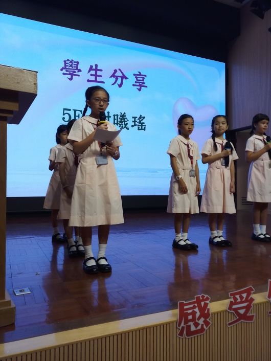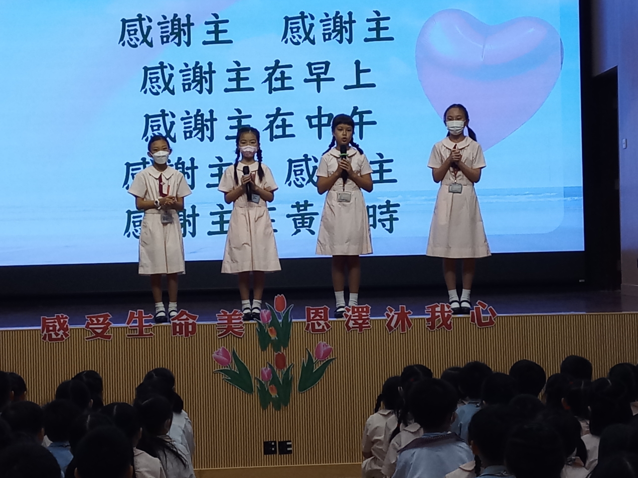 在禮堂分兩場進行,第一場小一、小三及小五;第二場小二、小四及小六。禮儀內容配合校本主題「感恩」。每級邀請一位同學代表,分享在不同範疇,就個人、家庭、學校、社區